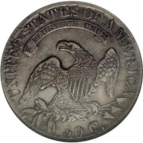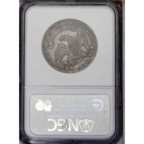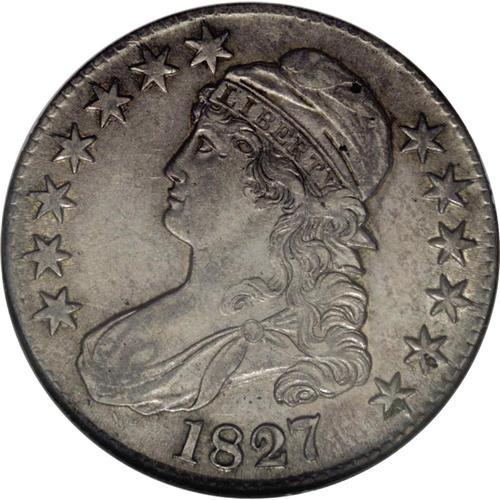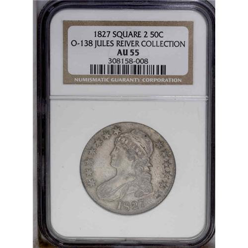 <B>1827<50C> Square Base 2 AU55 NGC.</B></I> O-138, R.4. Most easily attributed by the reverse which shows die defect lines below the eagle's head and left wing. The obverse clinches this die pairing with its thick based 2 in the date, high serif, and light parallel lines above the cap. Tied with at least two other AU55 coins at the bottom of the Condition Census, according to Stephen Herrman's auction data. The medium gray surfaces are accented by somewhat deeper patina around the peripheries. The reverse die shows signs of deterioration with many of the letters around the outside drawn toward the rim.<BR><I>Ex: Don Frederick (1/30/1980).</B></I> Envelope Included.