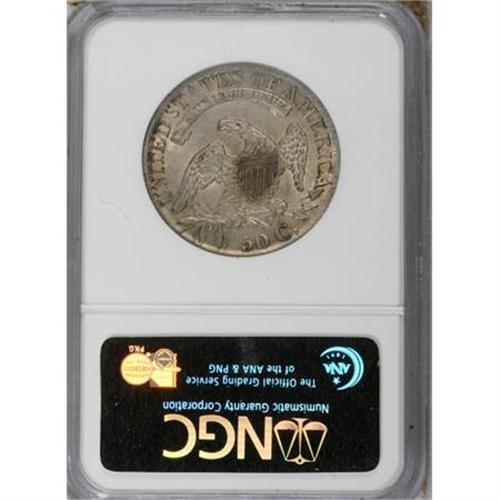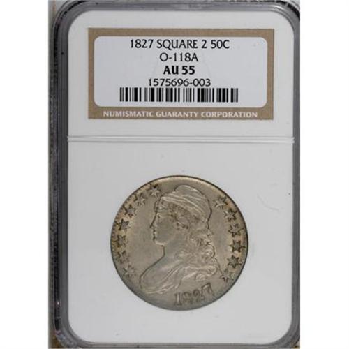 <B>1827 50C Square Base 2 AU55 NGC.</B></I> O-118A. NGC Census: (141/671). PCGS Population (174/494). Mintage: 5,493,400. Numismedia Wsl. Price for NGC/PCGS coin in AU55: $300. (#6144)<BR><BR><B>Coin Engraver:</B> John Reich<BR><BR><b>Shipping:</b> Coins & Currency (<a target="_blank" href="http://www.heritageauctions.com/common/shipping.php">view shipping information</a>)