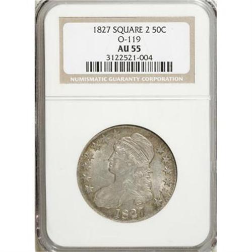 <B>1827 50C Square Base 2 AU55 NGC.</B></I> O-119. NGC Census: (145/902). PCGS Population (182/504). Mintage: 5,493,400. Numismedia Wsl. Price for NGC/PCGS coin in AU55: $300. (#6144)<BR><BR><B>Coin Engraver:</B> John Reich<BR><BR><b>Shipping:</b> Coins & Currency (<a target="_blank" href="http://www.heritageauctions.com/common/shipping.php">view shipping information</a>)