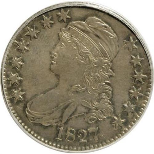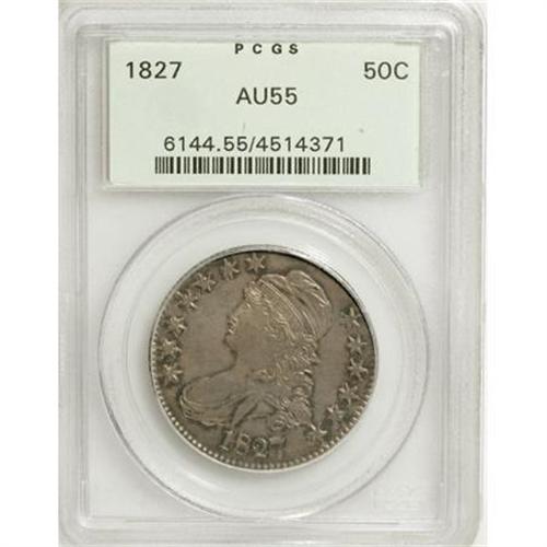 <B>1827 50C Square Base 2 AU55 PCGS.</B></I> PCGS Population (176/497). NGC Census: (141/671). Mintage: 5,493,400. Numismedia Wsl. Price for NGC/PCGS coin in AU55: $300. (#6144)<BR><BR><B>Coin Engraver:</B> John Reich<BR><BR><b>Shipping:</b> Coins & Currency (<a target="_blank" href="http://www.heritageauctions.com/common/shipping.php">view shipping information</a>)