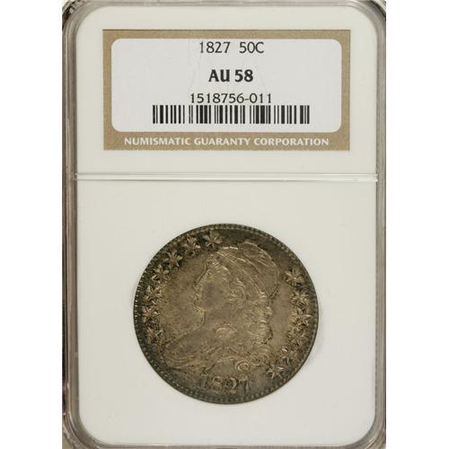 <B>1827 50C Square Base 2 AU58 NGC.</B></I> NGC Census: (556/768). PCGS Population (177/316). Mintage: 5,493,400. Numismedia Wsl. Price for NGC/PCGS coin in AU58: $590. (#6144)<BR><BR><b>Shipping:</b> Coins & Currency (<a target="_blank" href="http://www.heritageauctions.com/common/shipping.php">view shipping information</a>)