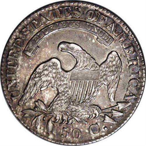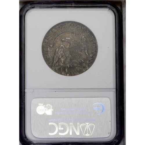 <B>1827<50C> Square Base 2 AU58 NGC.</B></I> O-104, R.1. Rich variegated toning covers both sides of this well struck example. No mentionable distractions are seen on either side of the piece, just a handful of minor marks to the left of Liberty's face and neck, and the amount of highpoint wear on each side is very slight.<BR><I>Ex: Stack's (6/20/1988).</B></I> Envelope Included.