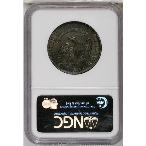 <B>1827<50C> Square Base 2 AU58 NGC.</B></I> O-138, R.4. Parallel lines above the cap and beneath the beak identify this scarce Overton marriage. Luster traverses the fields, and the surfaces are smooth beneath the deep lavender, golden-brown, and sea-green toning. A gray spot is noted between stars 11 and 12.
