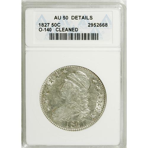 <B>1827 50C Square Base 2--Cleaned--ANACS. AU50 Details.</B></I> O-140, High R.4. NGC Census: (90/883). PCGS Population (94/736). Mintage: 5,493,400. Numismedia Wsl. Price: $221. (#6144)<BR><BR><b>Shipping:</b> Coins & Currency (<a target="_blank" href="http://www.heritageauctions.com/common/shipping.php">view shipping information</a>)