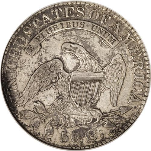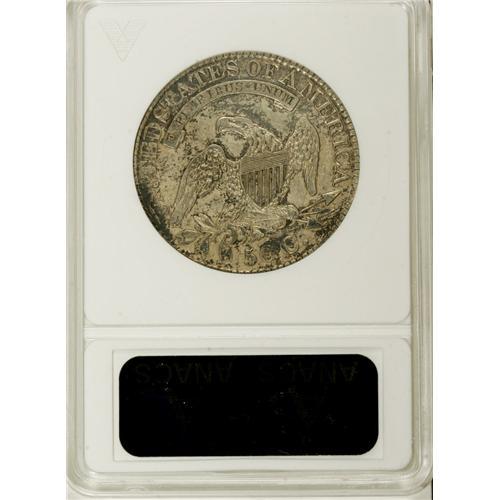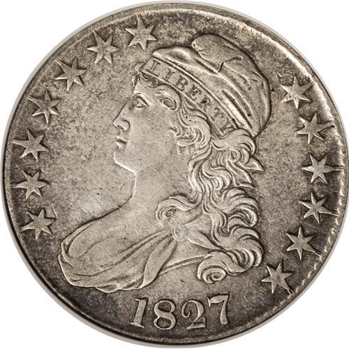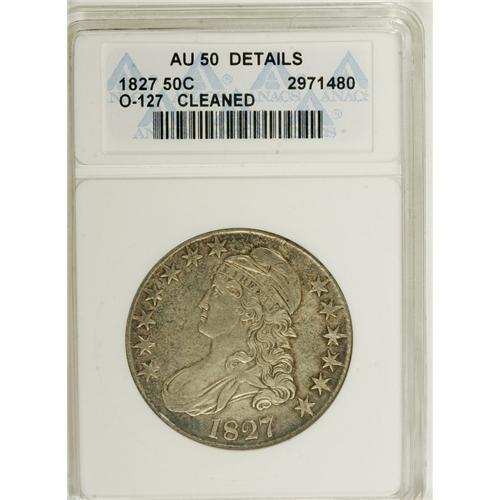 <B>1827 50C Square Base 2--Cleaned--ANACS. AU50 Details.</B></I> O-127, R.5. One of the finer examples offered of this scarce variety. In fact, in Stephen Herrman's latest listing of rare Bust half varieties, this piece is listed as third finest. Minor hairlines are present but are greatly subdued by the light gray-brown patina that covers the surfaces and deepens significantly around the devices. Unevenly struck, and showing evidence of die clashing with bars from the reverse shield present below Liberty's ear.<BR><BR><b>Shipping:</b> Coins & Currency (<a target="_blank" href="http://www.heritageauctions.com/common/shipping.php">view shipping information</a>)