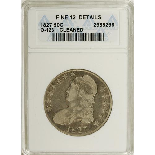 <B>1827 50C Square Base 2--Cleaned--ANACS. Fine 12 Details.</B></I> O123. NGC Census: (12/1269). PCGS Population (6/1068). Mintage: 5,493,400. Numismedia Wsl. Price for NGC/PCGS coin in F12: $38. (#6144)<BR><BR><b>Shipping:</b> Coins & Currency (<a target="_blank" href="http://www.heritageauctions.com/common/shipping.php">view shipping information</a>)