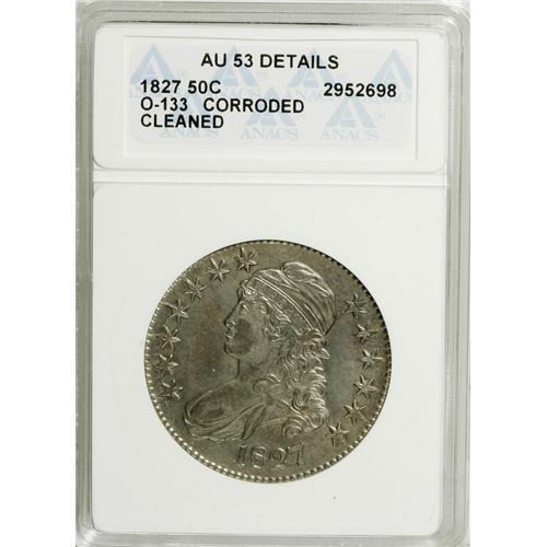 <B>1827 50C Square Base 2--Cleaned, Corroded--ANACS. AU53 Details.</B></I> O-133, R.4. NGC Census: (91/792). PCGS Population (78/658). Mintage: 5,493,400. Numismedia Wsl. Price: $233. (#6144)<BR><BR><b>Shipping:</b> Coins & Currency (<a target="_blank" href="http://www.heritageauctions.com/common/shipping.php">view shipping information</a>)