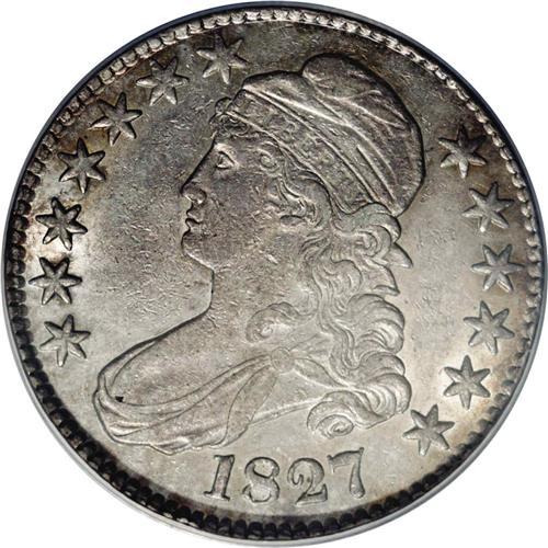 <B>1827<50C> Square Base 2--Damaged--NCS. AU Details.</B></I> O-142, R.3. The most readily identifiable die characteristic on Reverse AF are the pair of diagonal die lines below the eagle's left (facing) wing and the unfinished area in the die around the leaves. Each side is peppered with numerous small marks that appear to be the result of intentional damage. Nevertheless, the surfaces retain generous amounts of mint luster, and both sides exhibit golden-lilac patina. Well struck. Envelope Included.