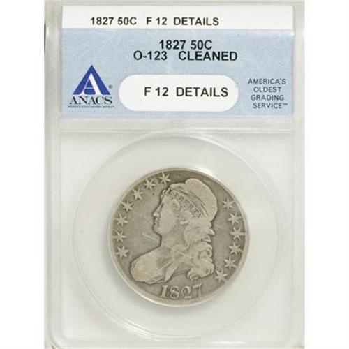 <B>1827 50C Square Base 2--Cleaned--ANACS. Fine 12 Details.</B></I> O-123. NGC Census: (5/1441). PCGS Population (6/1122). Mintage: 5,493,400. Numismedia Wsl. Price for NGC/PCGS coin in F12: $38. (#6144)<BR><BR><B>Coin Engraver:</B> John Reich<BR><BR><b>Shipping:</b> Coins & Currency (<a target="_blank" href="http://www.heritageauctions.com/common/shipping.php">view shipping information</a>)