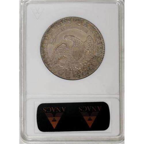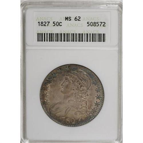 <B>1827 50C Square Base 2 MS62 ANACS.</B></I> O-134, R.4. Rich apricot and ocean-blue embrace this radiant and unblemished scarcer variety half. A complete collection of 1827 half dollars by Overton variety would challenge even the determined numismatist.<BR><BR><B>Coin Engraver:</B> John Reich<BR><BR><b>Shipping:</b> Coins & Currency (<a target="_blank" href="http://www.heritageauctions.com/common/shipping.php">view shipping information</a>)