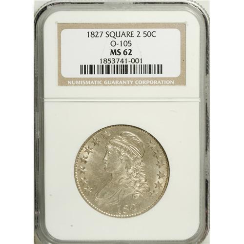 <B>1827 50C Square Base 2 MS62 NGC.</B></I> O-105, R.3. Highly lustrous and crisply struck to the left, though some details on the right lack definition. Minimally marked with pleasing pinkish-gold patina over each side.<BR><I>From The Jones Beach Collection.</B></I><BR><BR><b>Shipping:</b> Coin/Currency (<a target="_blank" href="http://www.heritageauctions.com/common/shipping.php">view shipping information</a>)