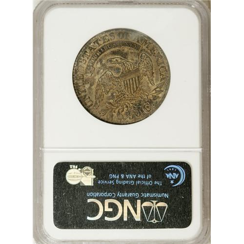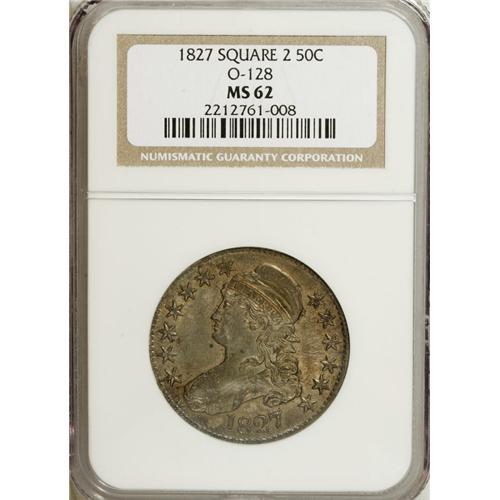 <B>1827 50C Square Base 2 MS62 NGC.</B></I> O-128, Low R.4. Rich khaki-gold and apple-green toning graces this satiny and unmarked piece. The scarcer O-128 variety is partly identified by a segmented I in PLURIBUS.<BR><BR><b>Shipping:</b> Coins & Currency (<a target="_blank" href="http://www.heritageauctions.com/common/shipping.php">view shipping information</a>)