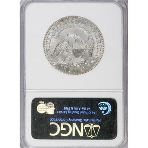 <B>1827 50C Square Base 2 MS62 NGC.</B></I> O-135, R.3. The variety is attributed by the A in STATES being slightly higher at the base than the first T, but well below the second T. Lustrous surfaces are untoned and exhibit sharply struck design features. A handful of small contact marks are noted on the obverse.<BR><BR><b>Shipping:</b> Coins & Currency (<a target="_blank" href="http://www.heritageauctions.com/common/shipping.php">view shipping information</a>)
