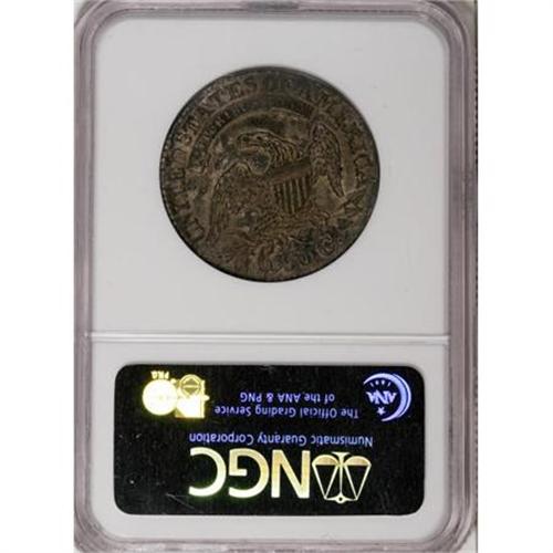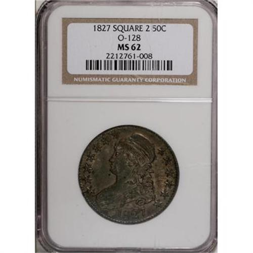 <B>1827 50C Square Base 2 MS62 NGC.</B></I> O-128, Low R.4. Rich khaki-gold and apple-green toning graces this satiny and unmarked piece. The scarcer O-128 variety is partly identified by a segmented I in PLURIBUS.<BR><BR><B>Coin Engraver:</B> John Reich<BR><BR><b>Shipping:</b> Coins & Currency (<a target="_blank" href="http://www.heritageauctions.com/common/shipping.php">view shipping information</a>)