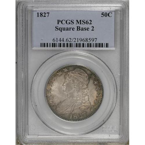 <B>1827 50C Square Base 2 MS62 PCGS.</B></I> O-106, R.2. Pleasingly detailed with vibrant luster and elements of amber-rose patina at the margins. Excellent eye appeal for the grade assigned with only a few wispy abrasions on and near the portrait.<BR><BR><B>Coin Engraver:</B> John Reich<BR><BR><b>Shipping:</b> Coins & Currency (<a target="_blank" href="http://www.heritageauctions.com/common/shipping.php">view shipping information</a>)