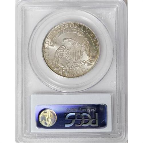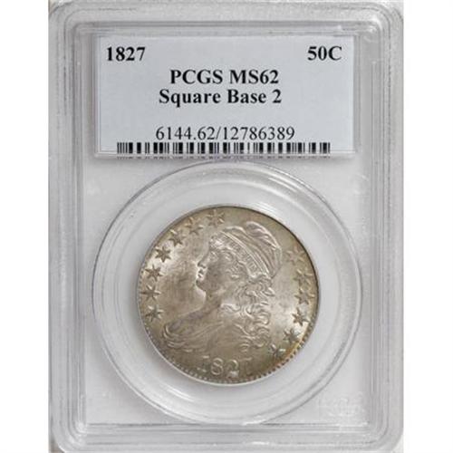 <B>1827 50C Square Base 2 MS62 PCGS.</B></I> O-126, R.2. Light die breaks in the lower hair of Liberty are diagnostic. A well-defined example, lightly toned gold-orange at the margins with ample silver-gray patina over the centers.<BR><BR><B>Coin Engraver:</B> John Reich<BR><BR><b>Shipping:</b> Coins & Currency (<a target="_blank" href="http://www.heritageauctions.com/common/shipping.php">view shipping information</a>)