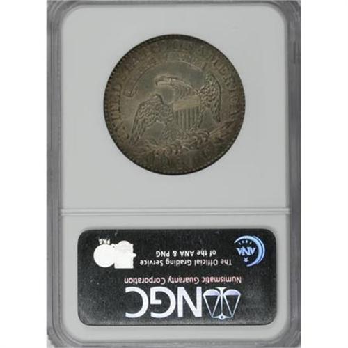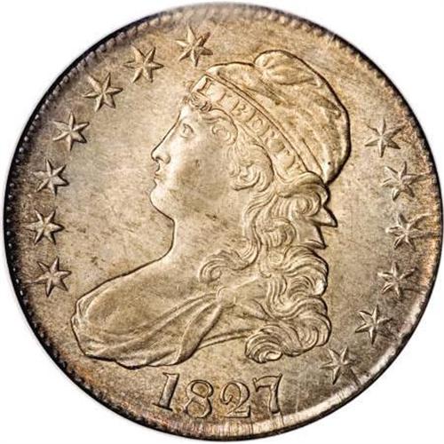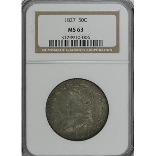 <B>1827 50C Square Base 2 MS63 NGC.</B></I> O-130, R.3. Possibly the finest known example of the variety. The Autumn 2007 Herrman is headed by an MS63 NGC, ex: Alpine Numismatics, and it is followed by only three other pieces, two MS62 PCGS pieces and an MS61 NGC. The fourth edition of Overton lists the Condition Census as 63,55,55,53,50. Medium pearl-gray, sun-gold, and ruby-red enrich this satiny and lightly abraded example. The fields are uncommonly smooth.<BR><BR><B>Coin Engraver:</B> John Reich<BR><BR><b>Shipping:</b> Coins & Currency (<a target="_blank" href="http://www.heritageauctions.com/common/shipping.php">view shipping information</a>)