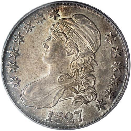 <B>1827 50C Square Base 2 MS63 PCGS.</B></I> O-134, R.4. The obvious recutting on several stars aids in attribution of this better Overton variety. This crisply struck example shows crescents of azure toning on each side, with the centers colored in a melange of smoky gray, amber, and copper.<BR><I>From The Westmoreland, Virginia Collection.</B></I>