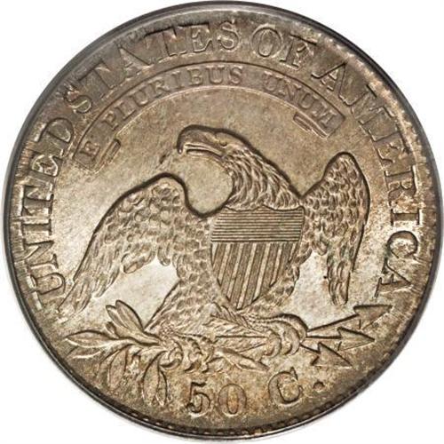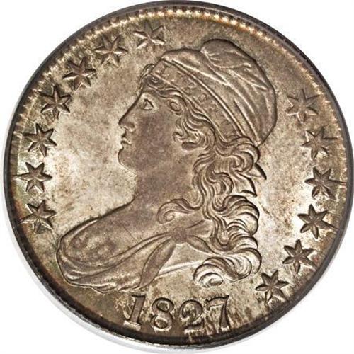 <B>1827 50C Square Base 2 MS63 PCGS.</B></I> O-142, R.3. A diagonal die line within the feathers near the upper right shield corner identify the Overton marriage. Cream-gray, olive, and autumn-brown enrich this satiny and boldly struck representative. A couple of hair-thin marks on the portrait are of no importance, and the fields are unabraded.<BR><BR><B>Coin Engraver:</B> John Reich<BR><BR><b>Shipping:</b> Coins & Currency (<a target="_blank" href="http://www.heritageauctions.com/common/shipping.php">view shipping information</a>)