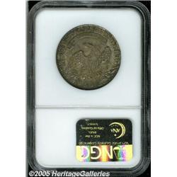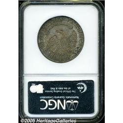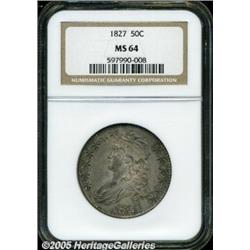 <B>1827 50C Square Base 2 MS64 NGC.</B></I> O-108, R.4. Toned with deep gold and gray over luster with boldly struck devices throughout. This is an early die state with the tiny dot visible just above the first star point nearest to Liberty's bust. On the reverse there is a trace of the developing die rust below the T of UNITED in the field. This particular coin is apparently the second finest of the variety, and an important coin for the specialist as such. Scarce also as a type coin, and very difficult to locate in higher grades. Population: 80 in 64, 26 finer (2/05).