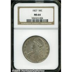 <B>1827 50C Square Base 2 MS64 NGC.</B></I> O-136, R.3. Satiny and lustrous throughout with appealing light silver color and no signs of toning. A decent strike for the period, with minor softness on the uppermost curls of Liberty and a couple of the obverse stars are a trifle weak at the center. The surfaces are very pleasing for the grade. Certainly scarce this nice and very rare appreciably finer.