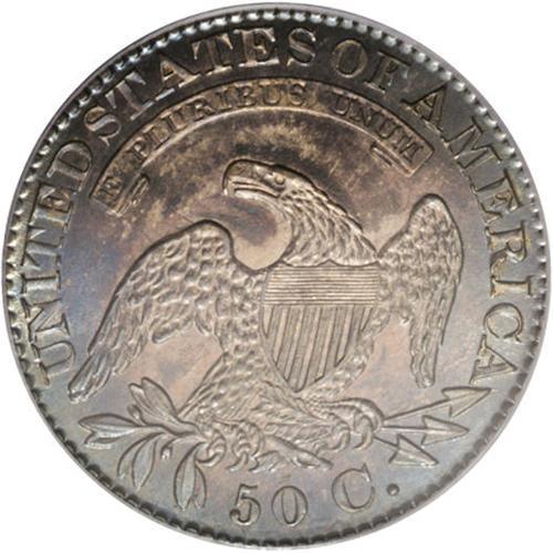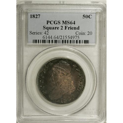 <B>1827 50C Square Base 2 MS64 PCGS.</B></I> O-107, R.3. Ex: Friend Collection. Richly toned in concentric shades of mauve and turquoise, with a uniformly bold strike that is characteristic of the die pairing. We note a few glancing marks on the face and on the field near the eagle's head.<BR><BR><b>Shipping:</b> Coins & Currency (<a target="_blank" href="http://www.heritageauctions.com/common/shipping.php">view shipping information</a>)