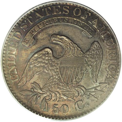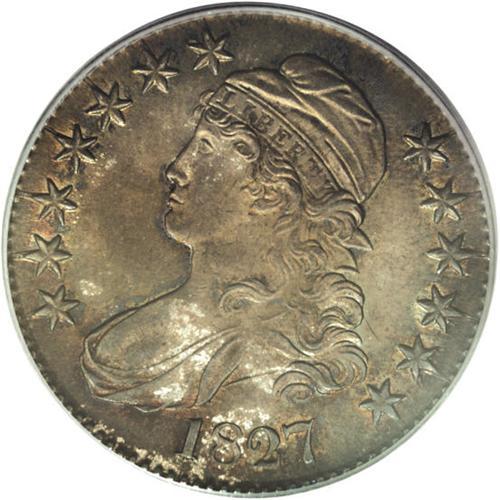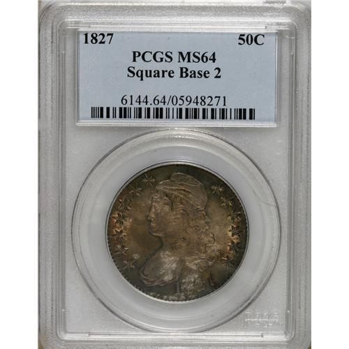 <B>1827 50C Square Base 2 MS64 PCGS.</B></I> O-132, R.3. The C in the denomination is recut along the front of the serif, which aids rapid attribution. Deep orange-gold and olive-brown patina envelops this exactingly struck and satiny representative. Marks are difficult to find, even with the aid of a glass.<BR><BR><b>Shipping:</b> Coins & Currency (<a target="_blank" href="http://www.heritageauctions.com/common/shipping.php">view shipping information</a>)