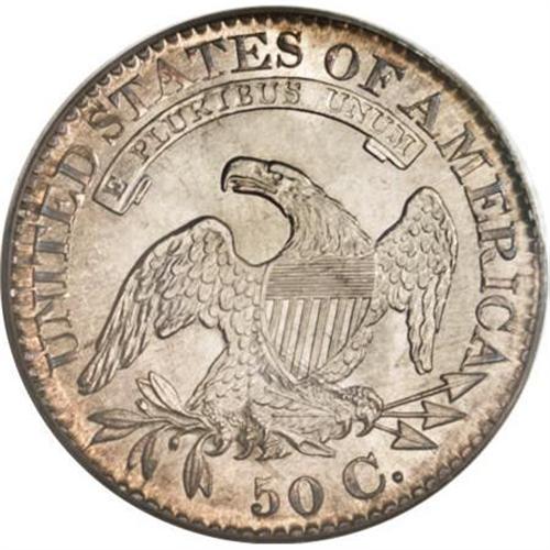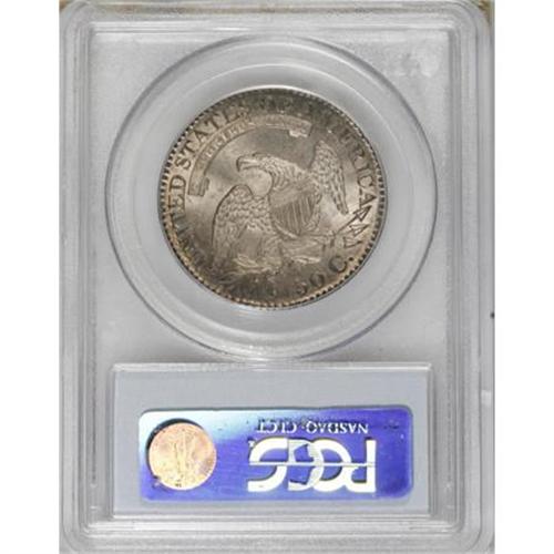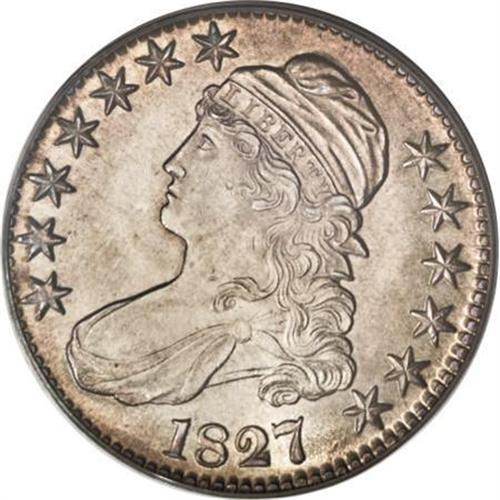 <B>1827 50C Square Base 2 MS64 PCGS.</B></I> O-118, R.3. The first line of stripe 4 in the shield extends heavily below the shield border, an instant identification point for the variety. This splendid Mint State piece has rich gray-gold luster with traces of iridescence over the frosty silver surfaces.<BR><BR><B>Coin Engraver:</B> John Reich<BR><BR><b>Shipping:</b> Coins & Currency (<a target="_blank" href="http://www.heritageauctions.com/common/shipping.php">view shipping information</a>)