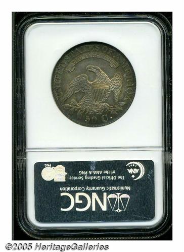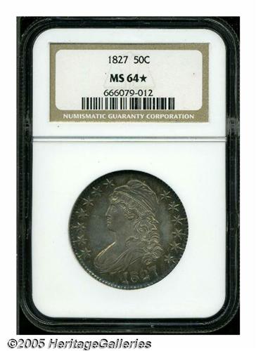 <B>1827<50C> Square Base 2 MS64 <S NGC.</B></I> O-142, R.3. Beautiful electric-blue, orange-gold, and lime-green colors endow this crisply struck representative. There are no detrimental abrasions, and the eye appeal from the lovely patina is undeniable. 1827 Half Dollars present a formidable challenge to the specialist, as there are 49 varieties and three of these (O-137, O-148, and O-149) are very rare.