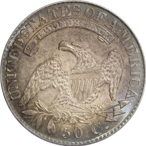 <B>1827 50C Square Base 2 MS65 PCGS.</B></I> O-105, R.3. This is an exceptionally attractive Gem Mint State piece with mostly well-defined design features on each side. The surfaces are fully lustrous and frosty, beneath pale gold toning with vibrant steel-blue toning along the borders. Population: 14 in 65, 4 finer (12/06).<BR><BR><b>Shipping:</b> Coin/Currency (<a target="_blank" href="http://www.heritageauctions.com/common/shipping.php">view shipping information</a>)