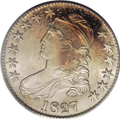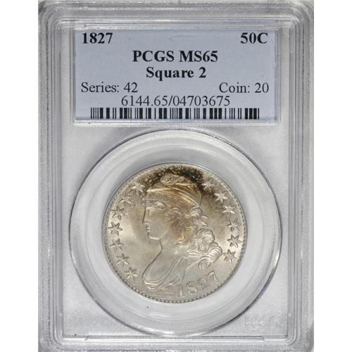 <B>1827 50C Square Base 2 MS65 PCGS.</B></I> O-120a, R.4. Bold die lines near the bust truncation provide ready identification from the myriad die combinations of this widely collected date. A well preserved example with pleasing cartwheel shimmer. The back of Liberty's portrait offers rich almond-gold and russet toning, while the fields are milky pearl-gray. The major devices are intricately struck, albeit some of the right side stars are not fully brought up. 1827 halves survive in quantity in VF and XF grades, but Gems are seldom encountered. Population: 14 in 65, 4 finer (12/06).<BR><BR><b>Shipping:</b> Coin/Currency (<a target="_blank" href="http://www.heritageauctions.com/common/shipping.php">view shipping information</a>)