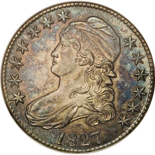 <B>1827 50C Square Base 2 MS66 NGC.</B></I> O-112, R.3. This is the early die state for the variety with no evidence of obverse die cracks. It is a nicely made piece with good design definition and excellent centering. When this piece was offered in the 2003 ANA Sale, the cataloger described it as "a visual treat for the lover of toned coins," words that cannot be disputed. Each side has pale gold color at the centers with blue and iridescent toning about the peripheries. It is nicely struck and fully lustrous with frosty surfaces beneath the toning. Census: 8 in 66, 2 finer (11/06), this data representing all examples of the date.<BR><BR><b>Shipping:</b> Coin/Currency (<a target="_blank" href="http://www.heritageauctions.com/common/shipping.php">view shipping information</a>)
