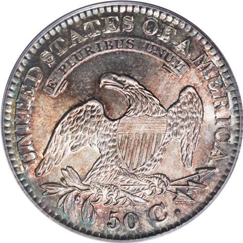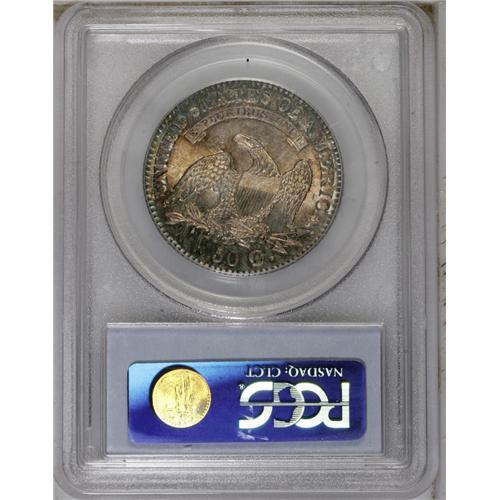 <B>1827<50C> Square Base 2 MS66 PCGS.</B></I> O-133, R.4. Orange-red and dove-gray fields and devices concede to peripheral forest-green and ocean-blue patina. This intricately struck Premium Gem displays potent luster, and lacks any mentionable marks. Three sets of clashmarks are apparent on the reverse field. 1827 is notorious for its proliferation of die varieties. Fortunately for collectors (and catalogers), the scarce Overton-133 has numerous diagnostics, such as several repunched stars, a die line in the field above the claws, and a line above the LI in LIBERTY. The present piece surely ranks among the finest known for the variety. Herrman's census lists a single MS65 followed by three MS63 pieces. Population: 3 in 66, 1 finer (9/06).