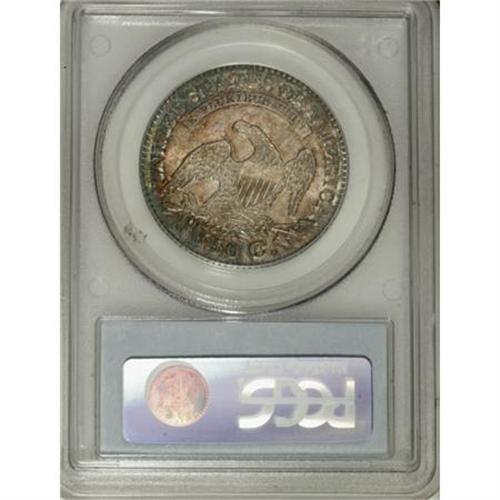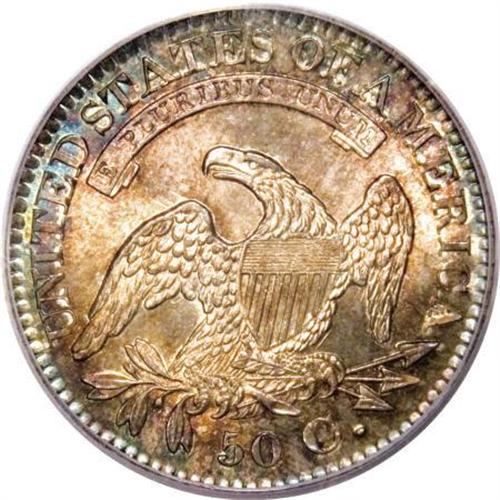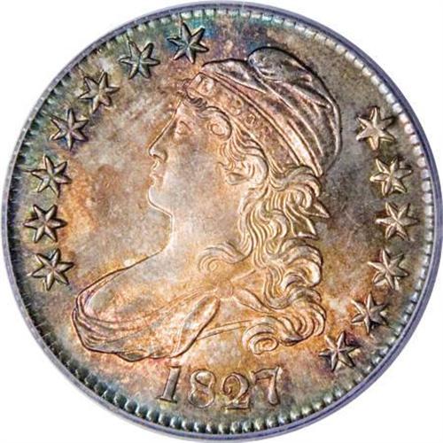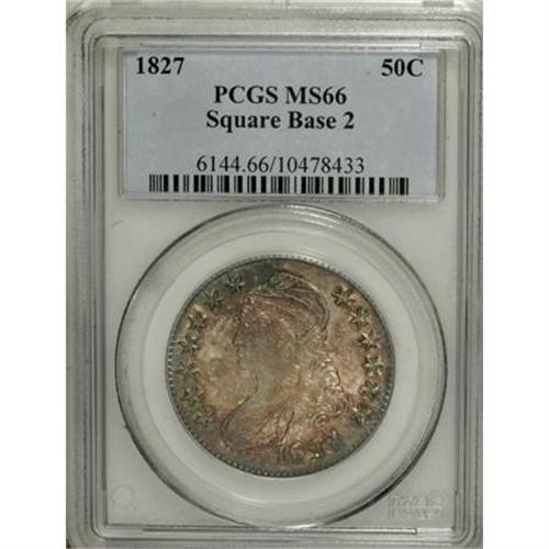 <B>1827 50C Square Base 2 MS66 PCGS.</B></I> O-133, R.4. Orange-red and dove-gray fields and devices concede to peripheral forest-green and ocean-blue patina. This intricately struck Premium Gem displays potent luster, and lacks any mentionable marks. Three sets of clashmarks are apparent on the reverse field. 1827 is notorious for its proliferation of die varieties. Fortunately for collectors (and catalogers), the scarce Overton-133 has numerous diagnostics, such as several repunched stars, a die line in the field above the claws, and a line above the LI in LIBERTY. The present outstanding piece surely ranks among the finest known for the variety. Population: 3 in 66, 1 finer (11/07).<BR><I>From The Madison Collection.</B></I><BR><BR><B>Coin Engraver:</B> John Reich<BR><BR><b>Shipping:</b> Coins & Currency (<a target="_blank" href="http://www.heritageauctions.com/common/shipping.php">view shipping information</a>)