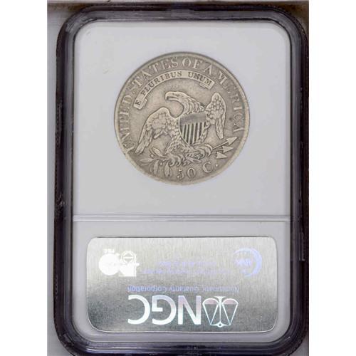 <B>1827<50C> Square Base 2 VF25 NGC.</B></I> O-144, High R.5. The O-144 is determined by the third pale of gule five, which extends upward between azures three and four from the bottom. This specimen offers pleasing medium gray surfaces and a middling strike, with the reverse die showing some erosion. This is a very rare die pairing and one of the more difficult issues to obtain from this most challenging year for the die variety collector.<BR><I>Ex: Merkel (11/19/1986).</B></I> Envelope Included.