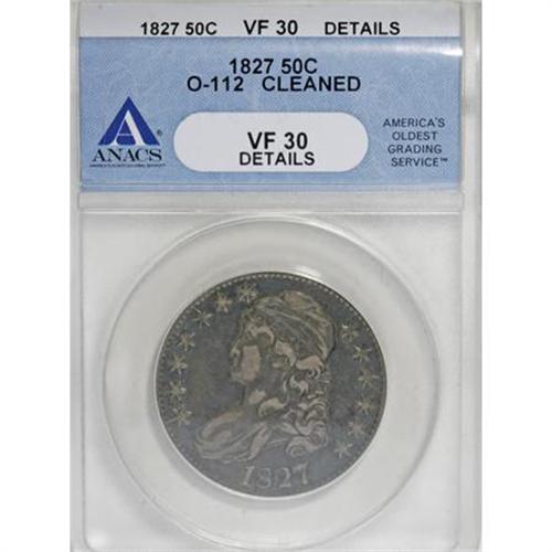 <B>1827 50C Square Base 2--Cleaned--ANACS. VF30 Details.</B></I> O-112. NGC Census: (8/1436). PCGS Population (28/1062). Mintage: 5,493,400. Numismedia Wsl. Price for NGC/PCGS coin in VF30: $98. (#6144)<BR><BR><B>Coin Engraver:</B> John Reich<BR><BR><b>Shipping:</b> Coins & Currency (<a target="_blank" href="http://www.heritageauctions.com/common/shipping.php">view shipping information</a>)