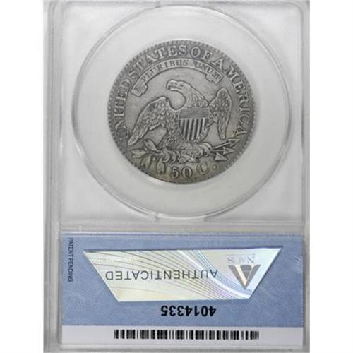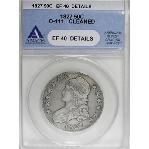 <B>1827 50C Square Base 2--Cleaned--ANACS. XF40 Details.</B></I> O-111, R.4. This Bust half is cloudy from hairlines, and traces of ebony debris cling to design recesses. A scarce Overton variety identified by the key hole-shaped die defect at the base of the shield.<BR><BR><B>Coin Engraver:</B> John Reich<BR><BR><b>Shipping:</b> Coins & Currency (<a target="_blank" href="http://www.heritageauctions.com/common/shipping.php">view shipping information</a>)