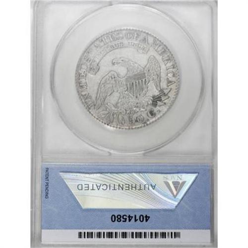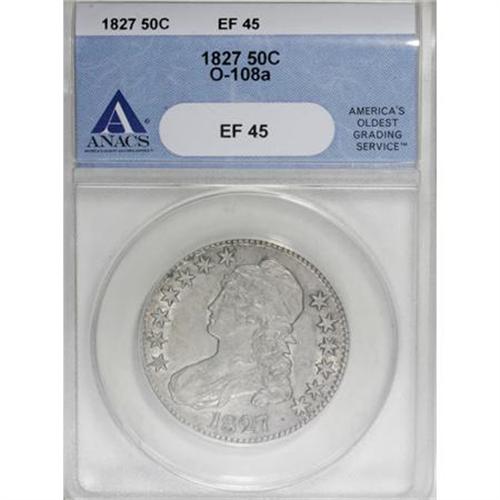 <B>1827 50C Square Base 2 XF45 ANACS.</B></I> O-108a, R.4. According to Glenn Peterson, strikes from these dies were interrupted by 1828 O-101, which shares the same reverse die. The second pairing of the O-108 dies is noted for a die lump above the crossbar of the F in OF. This dusky silver-gray example is unabraded aside from nearly imperceptible hairlines.<BR><BR><B>Coin Engraver:</B> John Reich<BR><BR><b>Shipping:</b> Coins & Currency (<a target="_blank" href="http://www.heritageauctions.com/common/shipping.php">view shipping information</a>)