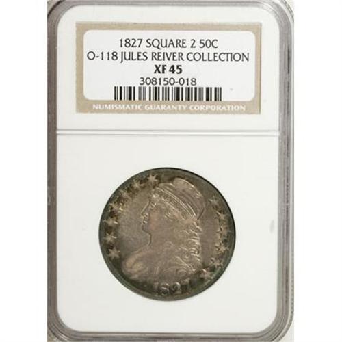 <B>1827 50C Square Base 2 XF45 NGC.</B></I> O-118. Ex: Jules Reiver Collection. NGC Census: (101/1000). PCGS Population (90/859). Mintage: 5,493,400. Numismedia Wsl. Price for NGC/PCGS coin in XF45: $131. (#6144)<BR><BR><B>Coin Engraver:</B> John Reich<BR><BR><b>Shipping:</b> Coins & Currency (<a target="_blank" href="http://www.heritageauctions.com/common/shipping.php">view shipping information</a>)