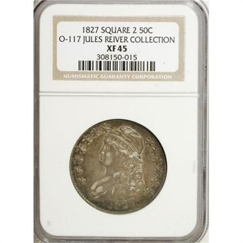 <B>1827 50C Square Base 2 XF45 NGC.</B></I> O-117. Ex: Jules Reiver Collection. NGC Census: (101/1000). PCGS Population (90/859). Mintage: 5,493,400. Numismedia Wsl. Price for NGC/PCGS coin in XF45: $131. (#6144)<BR><BR><B>Coin Engraver:</B> John Reich<BR><BR><b>Shipping:</b> Coins & Currency (<a target="_blank" href="http://www.heritageauctions.com/common/shipping.php">view shipping information</a>)