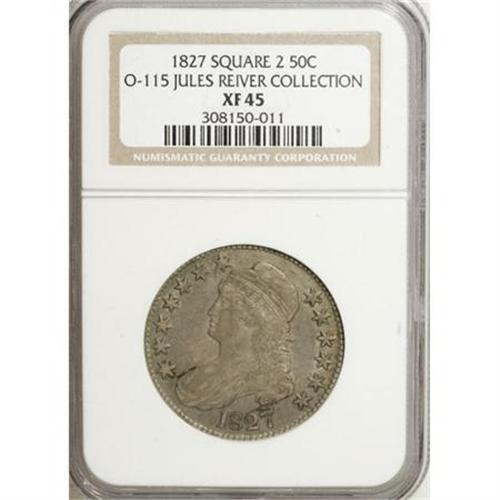 <B>1827 50C Square Base 2 XF45 NGC.</B></I> O-115. Ex: Jules Reiver Collection. NGC Census: (101/1000). PCGS Population (90/859). Mintage: 5,493,400. Numismedia Wsl. Price for NGC/PCGS coin in XF45: $131. (#6144)<BR><BR><B>Coin Engraver:</B> John Reich<BR><BR><b>Shipping:</b> Coins & Currency (<a target="_blank" href="http://www.heritageauctions.com/common/shipping.php">view shipping information</a>)