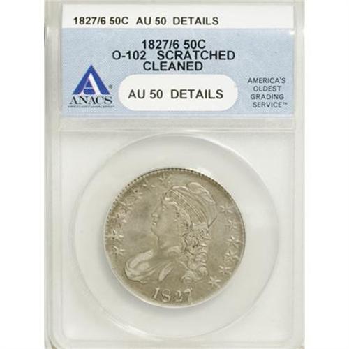 <B>1827/6 50C --Cleaned, Scratched--ANACS. AU50 Details.</B></I> O-102. NGC Census: (4/52). PCGS Population (18/64). Numismedia Wsl. Price for NGC/PCGS coin in AU50: $300. (#6147)<BR><BR><B>Coin Engraver:</B> John Reich<BR><BR><b>Shipping:</b> Coins & Currency (<a target="_blank" href="http://www.heritageauctions.com/common/shipping.php">view shipping information</a>)
