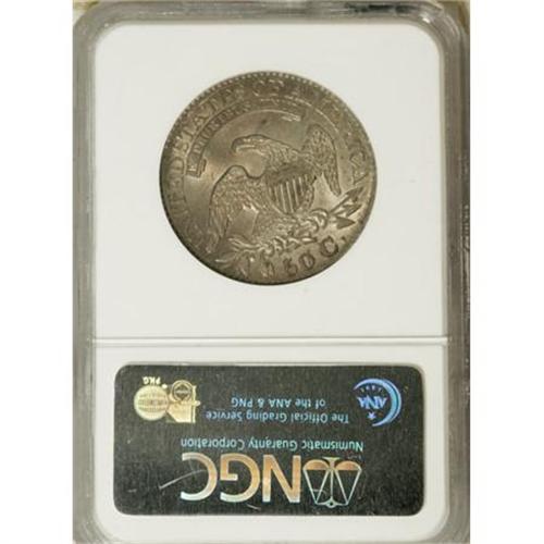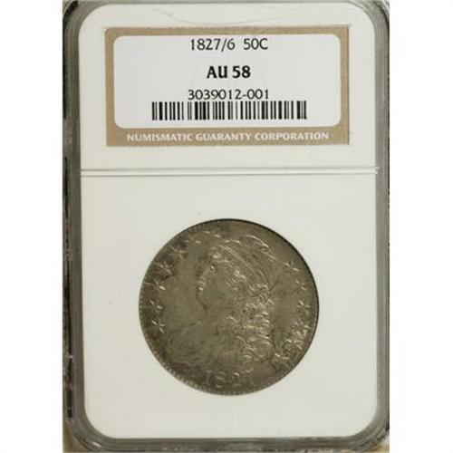 <B>1827/6 50C AU58 NGC.</B></I> O-103, R.4. The scarcest of three overdate varieties from a single obverse die, the O-103 marriage is recognized by the extended center line of stripe 4 that reaches the fourth crossbar. A trace of wear is evident on each side of this lightly toned example. Considerable satin luster is still visible.<BR><BR><B>Coin Engraver:</B> John Reich<BR><BR><b>Shipping:</b> Coins & Currency (<a target="_blank" href="http://www.heritageauctions.com/common/shipping.php">view shipping information</a>)
