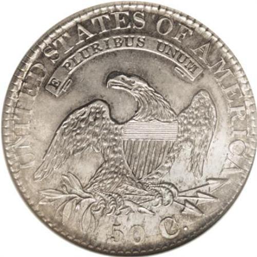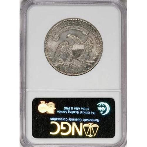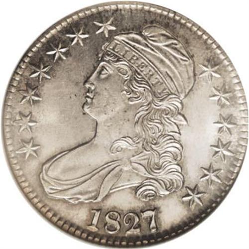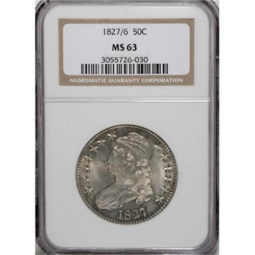 <B>1827/6 50C MS63 NGC.</B></I> O-101, R.2. Noticeable portions of the 6 are seen on both sides of the 7. Heavily die cracked, as always, around the reverse periphery. The striking details are remarkably strong, especially considering the piece was produced with a screw press, with no localized areas of weakness. Much brilliance remains with a light accent of color around the devices. Only a couple of small marks can be seen, both located in the left obverse field. Several examples are known in mint condition of this variety.<BR><BR><BR><B>Coin Engraver:</B> John Reich<BR><BR><b>Shipping:</b> Coins & Currency (<a target="_blank" href="http://www.heritageauctions.com/common/shipping.php">view shipping information</a>)