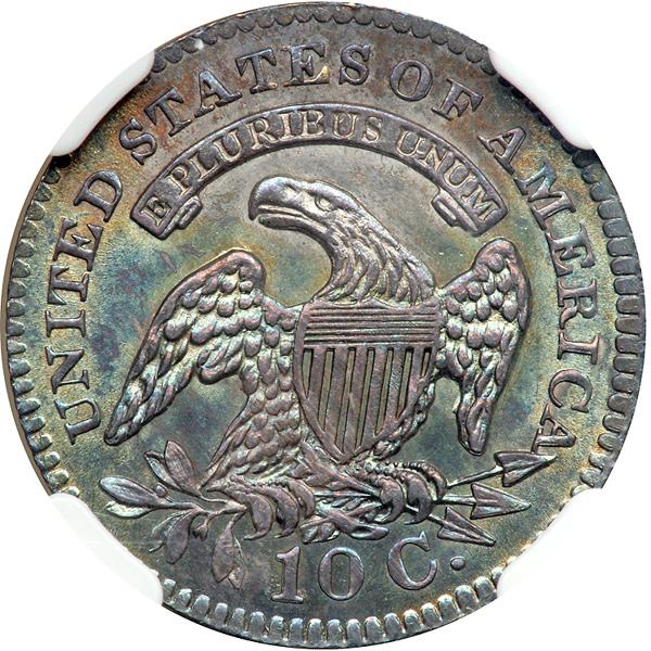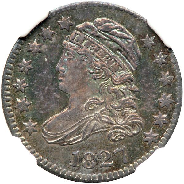 1827 Capped Bust Dime. . JR-12, Rarity-1. NGC graded MS-65. Nice blue toning with reflective fields. For the date, a wonderfully original Gem Mint State coin featuring enlivening fresh luster on both sides. Attractively struck as well, barring a hint of softness on the obverse stars and some of the shield stripes. The motto is strong, as is all lettering in the legends. Full rim dentils on both sides. JR-12 is one of the more widely available of thirteen die pairings for this issue, easily recognized by the low placement of the 7 in the date and the final A in AMERICA being solidly attached to the arrow. Pop 20; 7 finer, 5 in 66, 2 in 67.