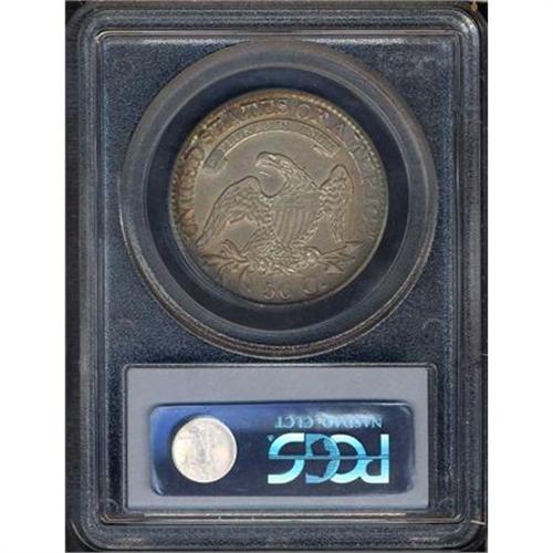 <b>1827 Capped Bust Half Dollar. Square base 2. PCGS graded AU50.</b> Smooth, toned surfaces display pale blue and gold iridescence on both sides, with choice light gray base of color <b>(PCGS # 6144)</b>