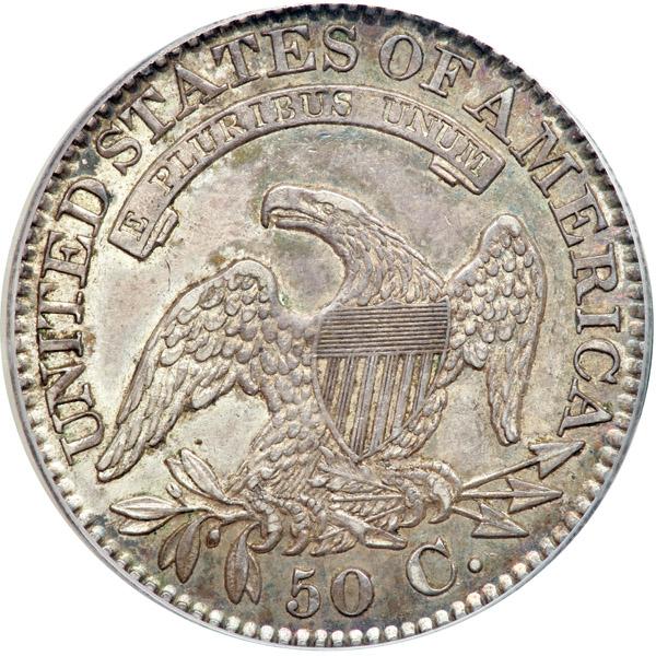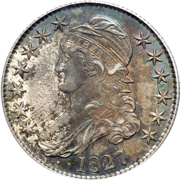 1827 Capped Bust Half Dollar. Square base 2. PCGS graded AU-58. Deep original antique toning on both sides, with luster a-plenty throughout the fields and devices (PCGS # 6144) .