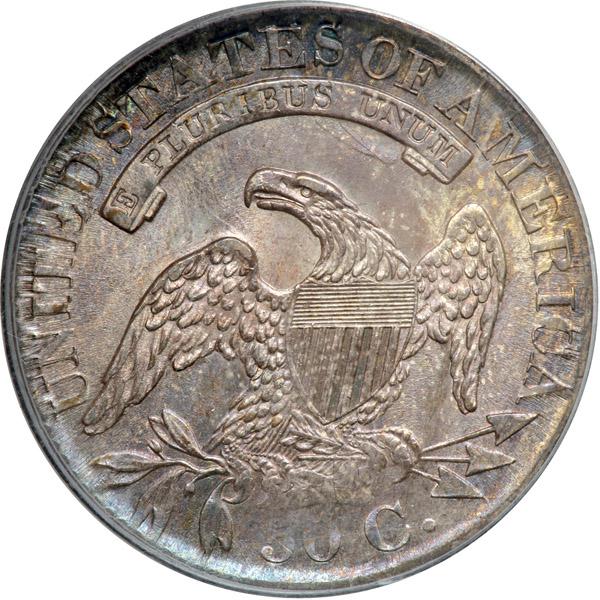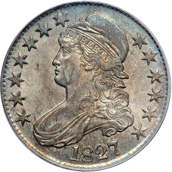 1827 Capped Bust Half Dollar. Square base 2. . O-128. PCGS graded MS-64. Beautiful multi-color toning on both sides. A very attractive near-gem with frosty surfaces that burst out atop the bright and hard-working toning on top. Some weak spots in strike is seen at the cap and topmost curls and stars; sharp scroll, eagle, and shield, with the denomination faint and most letters pulled toward the rim. Pop 82; 23 finer (PCGS # 6144) .