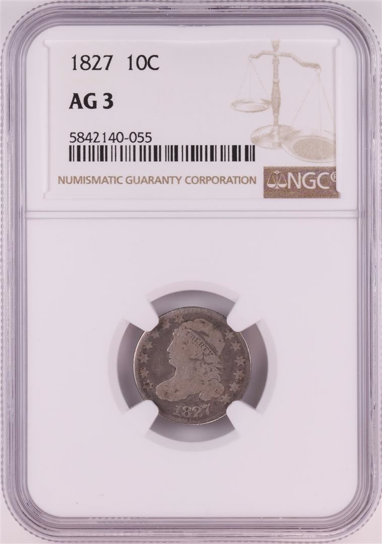 One 1827 Capped Bust Dime Coin NGC AG3. NGC Certified.