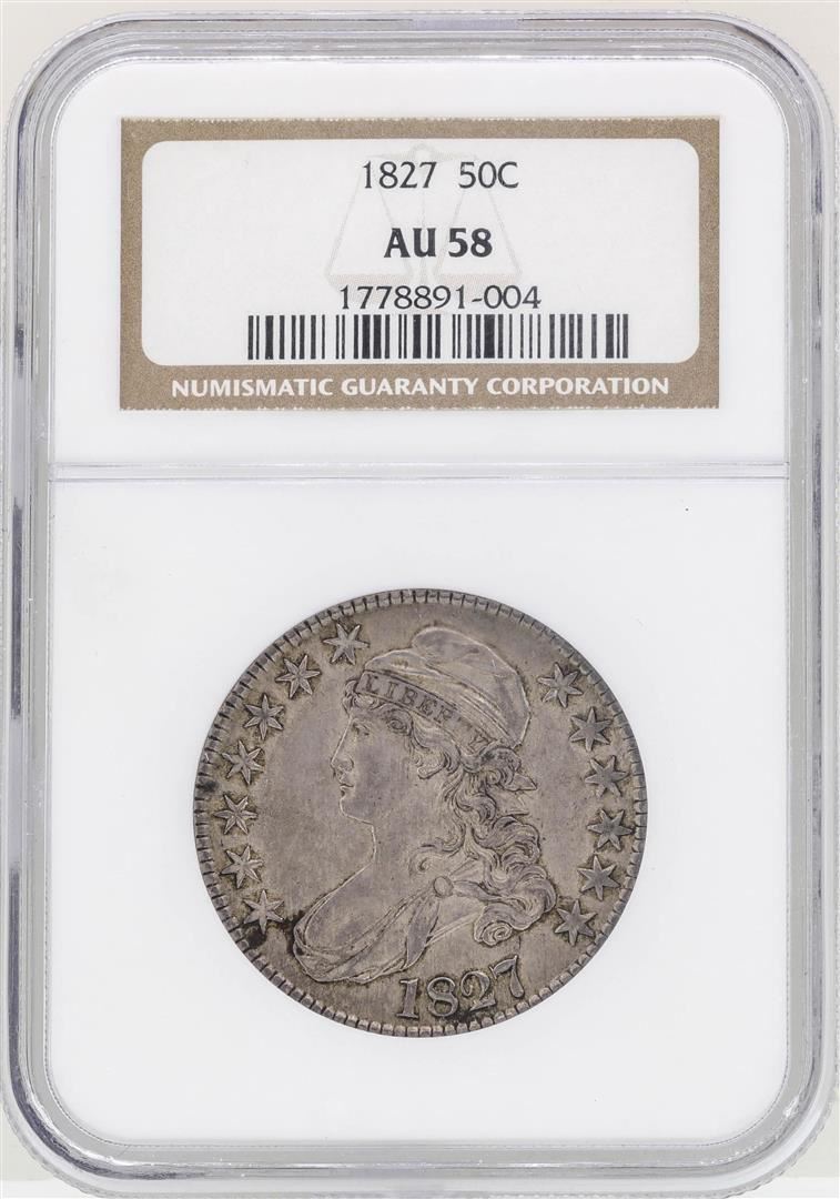 One 1827 Capped Bust Half Dollar Coin NGC AU58. NGC Certified.